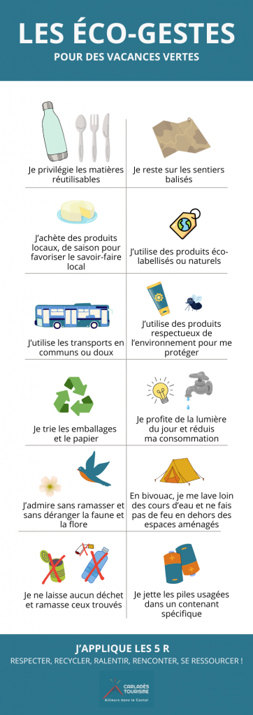 Enfin, à l’accueil, l’OT s’applique les mêmes exigences puisqu’il affiche les écogestes pour le public, les conseille sur les producteurs locaux, sur les règles à respecter en randonnée… et aussi en interne pour le personnel, puisqu’il veille aux économies d’énergie, à l’utilisation de produits verts, à la gestion de la documentation pour éviter tout gaspillage de papier, aux labels PEFC, imprim’vert des imprimeurs avec lesquels il travaille, et de façon générale avec tous les fournisseurs.